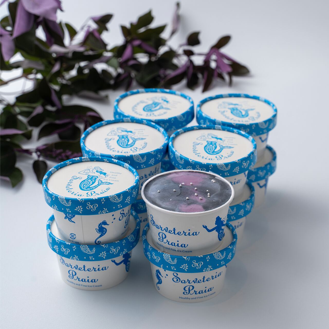 原材料名:牛乳(国内製造)、生クリーム、ブルーベリー、砂糖、ラズベリーピューレ、ぶどう糖、脱脂粉乳、トレハロース、粉あめ、乳たん白、カシスピューレ、卵黄、バタフライピー、竹炭、バニラペースト、食塩、アラザン(砂糖、とうもろこしでん粉、水飴、ゼラチン)/乳化剤、安定剤(増粘多糖類)、着色料(銀箔)、酢酸、(一部に乳成分・卵・ゼラチンを含む)
