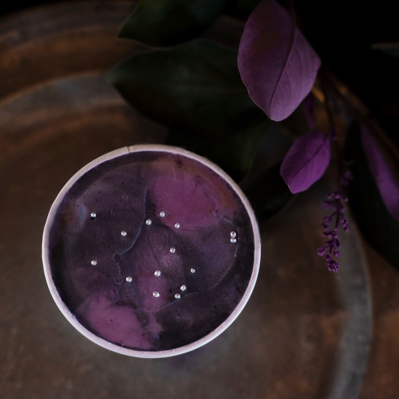 ブルーベリー、ラズベリー、バニラを重ね合わせ、深い夜空を思わせるブルーグレーに、星雲のように広がる紫と淡いピンクが特徴。一つひとつ表情の異なるマーブル模様に、アラザンを散りばめ、夜空に瞬く星を表現しました。